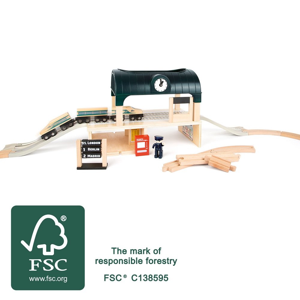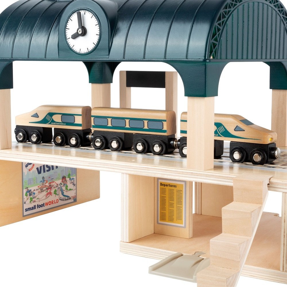 Στο κιόσκι του Σιδηροδρομικός Σταθμός με Αξεσουάρ της Small Foot οι επιβάτες απολαμβάνουν ένα μικρό σνακ και στα μηχανήματα εισιτηρίων παίρνουν το εισιτήριό τους, όπως ακριβώς στην πραγματικότητα. Το παιδί γυρίζει τον πίνακα προορισμών και γράφει με κιμωλία την επόμενη ώρα αναχώρησης. Τα κινητά ρολόγια δείχνουν την ώρα και από τις δύο πλευρές, ώστε κανένα τρένο να μη φύγει απαρατήρητο.