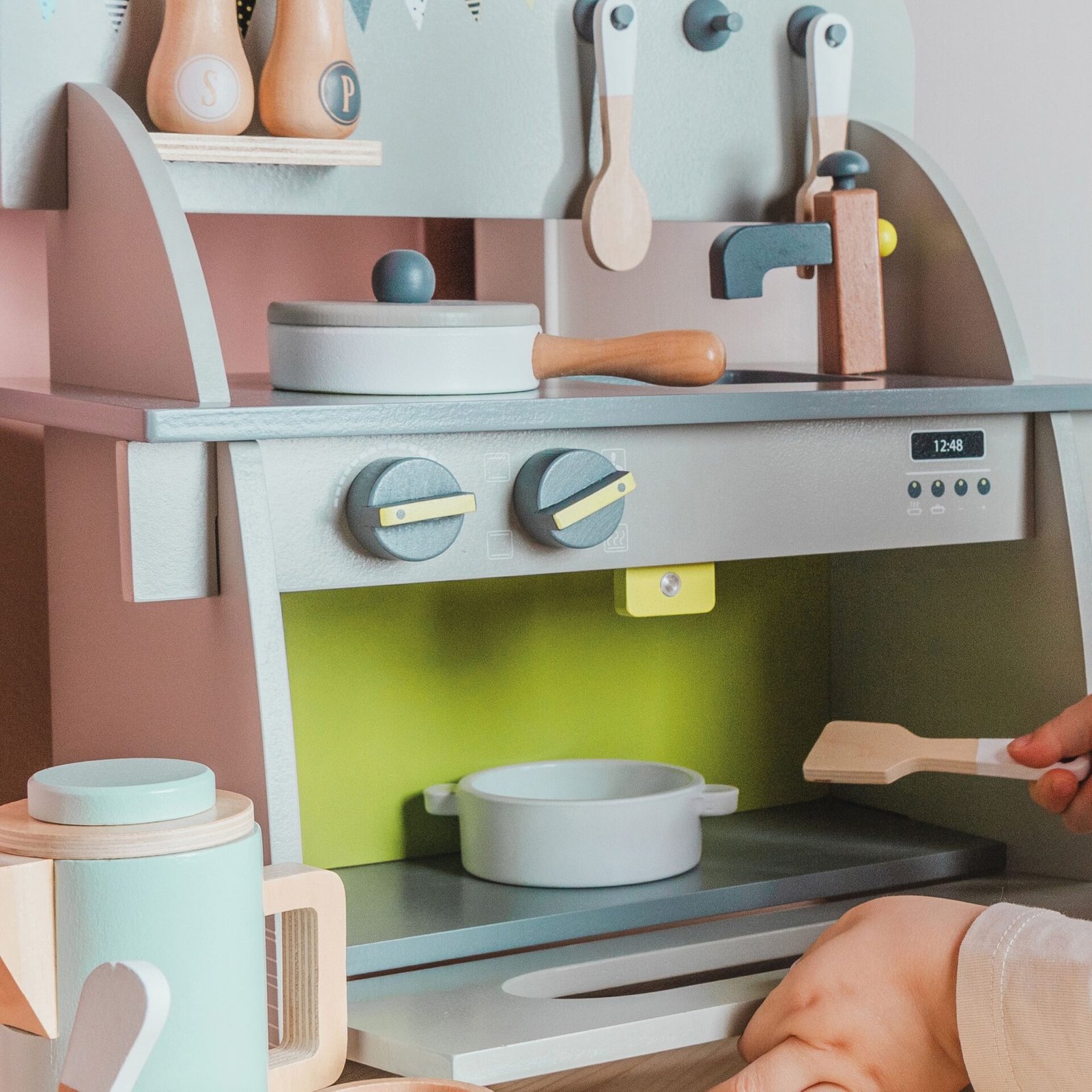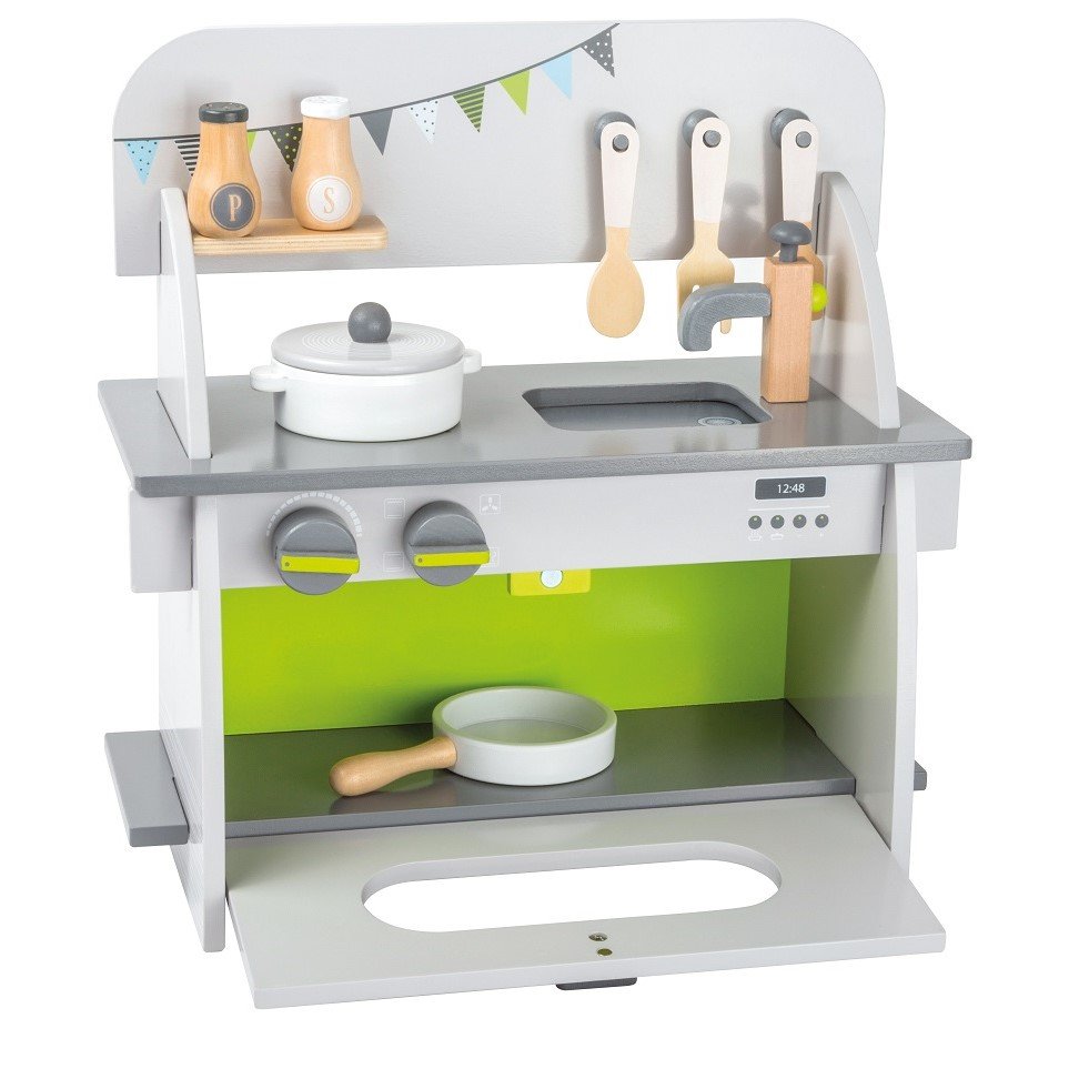 Η κουζίνα συνοδεύεται από τρία ξύλινα κουζινικά, αλατοπίπερο και κατσαρόλα με καπάκι. Η πόρτα του φούρνου κλείνει σταθερά με μαγνητικό μηχανισμό. Το παιδί στήνει και αποσυναρμολογεί την κουζίνα εύκολα, χωρίς εργαλεία, χάρη στο απλό σύστημα σύνδεσης.