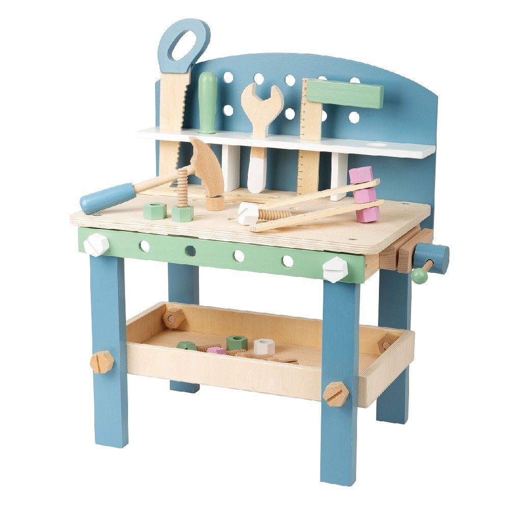Ο απαλός χρωματισμός και το σκανδιναβικό στυλ με εμφανές ξύλο δημιουργούν μια ζεστή αισθητική. Το παιχνίδι βοηθά το παιδί να αναπτύξει βασικές χειροτεχνικές δεξιότητες. Παράλληλα, ενισχύει τη λεπτή και αδρή κινητικότητα, καθώς και τον συντονισμό χεριού και ματιού. Το παιδί μπορεί ακόμη και να συμμετέχει στη συναρμολόγηση του πάγκου, κάνοντας το παιχνίδι πιο ουσιαστικό.