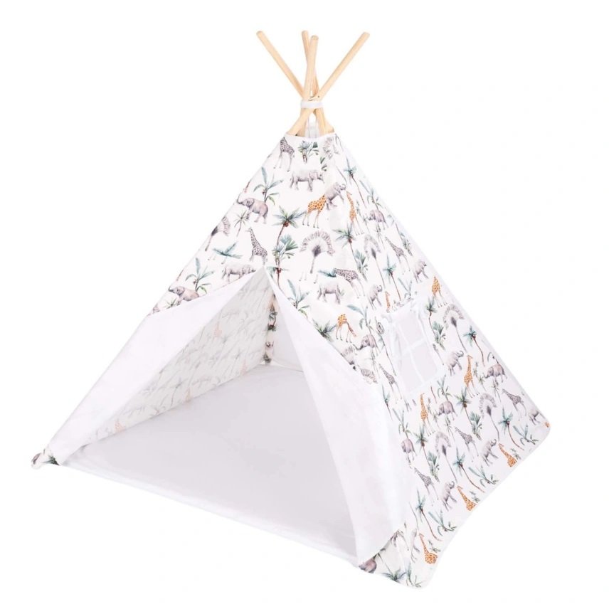 Η σκηνή στήνεται και διπλώνει εύκολα, ενώ στο εσωτερικό της φιλοξενεί μαλακό στρωματάκι και ένα μικρό παράθυρο που εμπνέει ατελείωτες ιστορίες και δημιουργικό παιχνίδι. Το σχέδιο Safari με τα χαριτωμένα ζωάκια και τα φοινικόδεντρα φέρνει μια παιχνιδιάρικη ζούγκλα στο παιδικό δωμάτιο.
